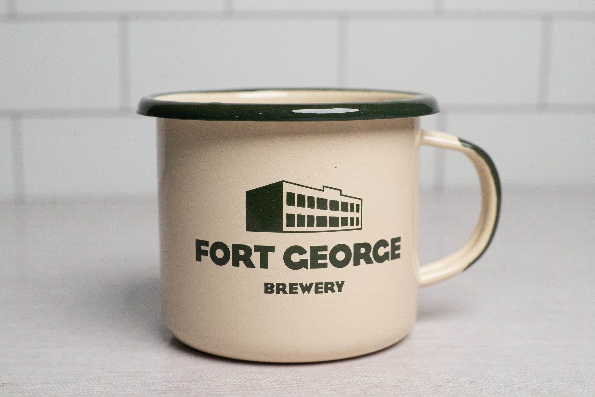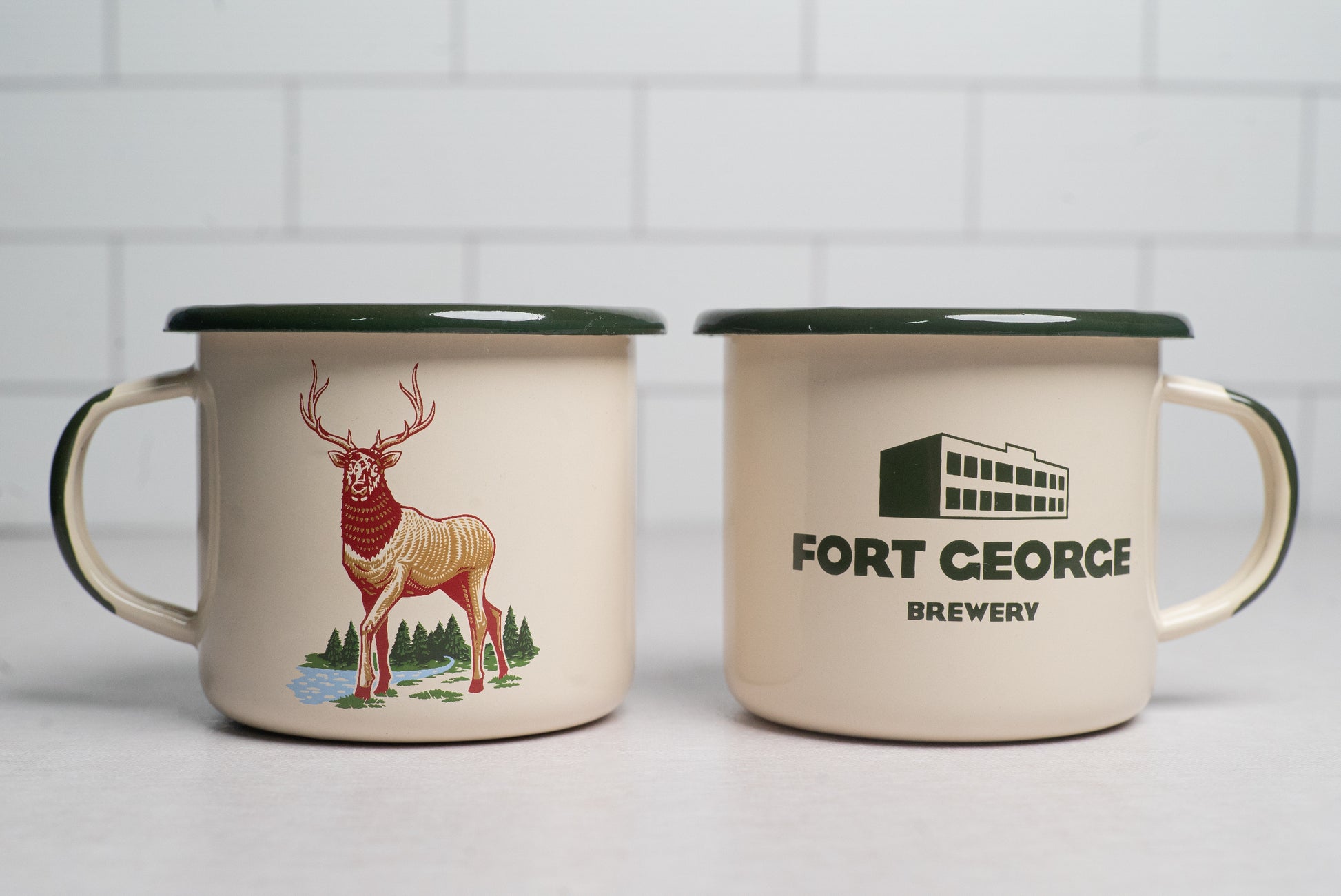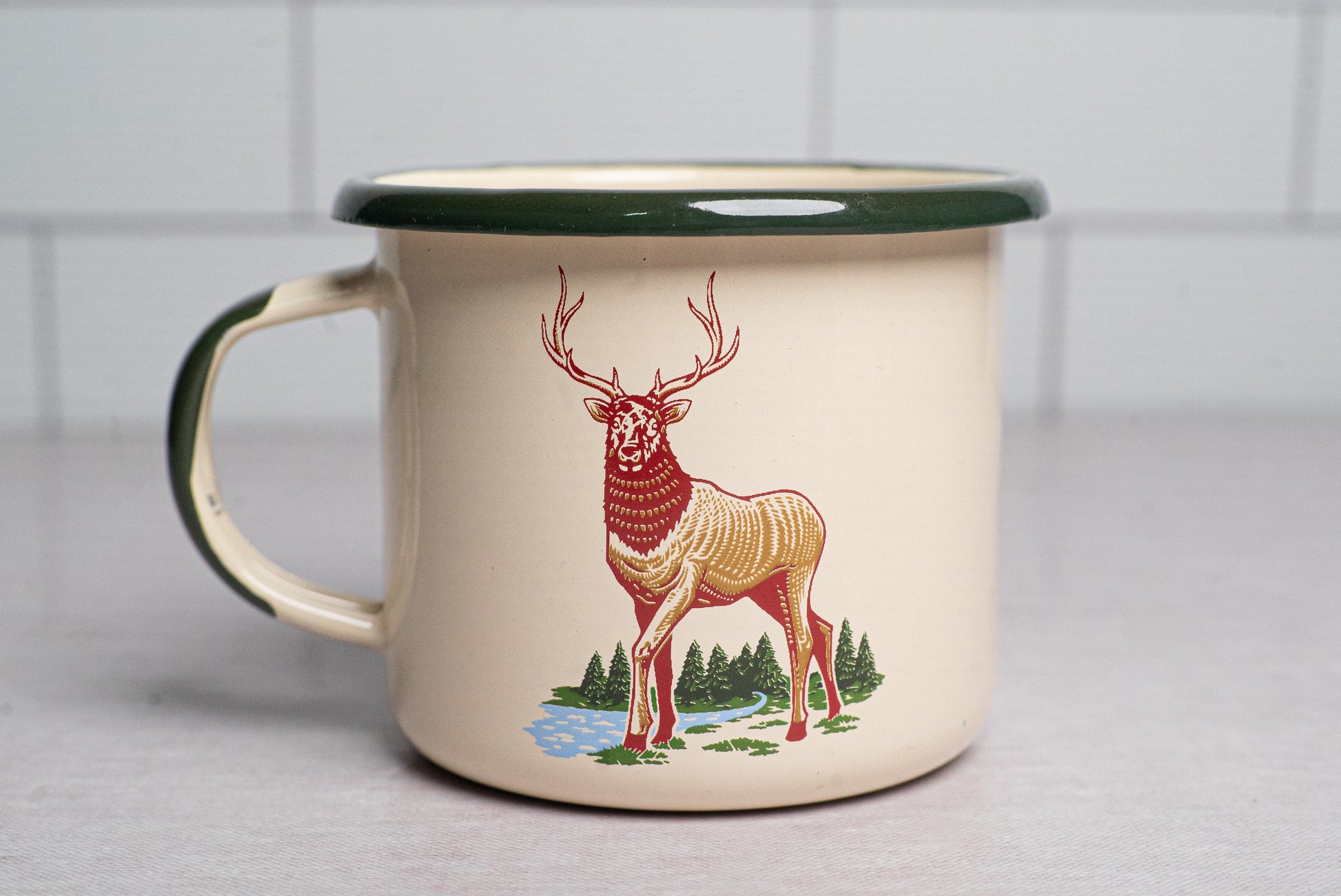 High quality, hand crafted, super durable European-made Emalco Enamel camp mug with a Lower Columbia Lager Stag.