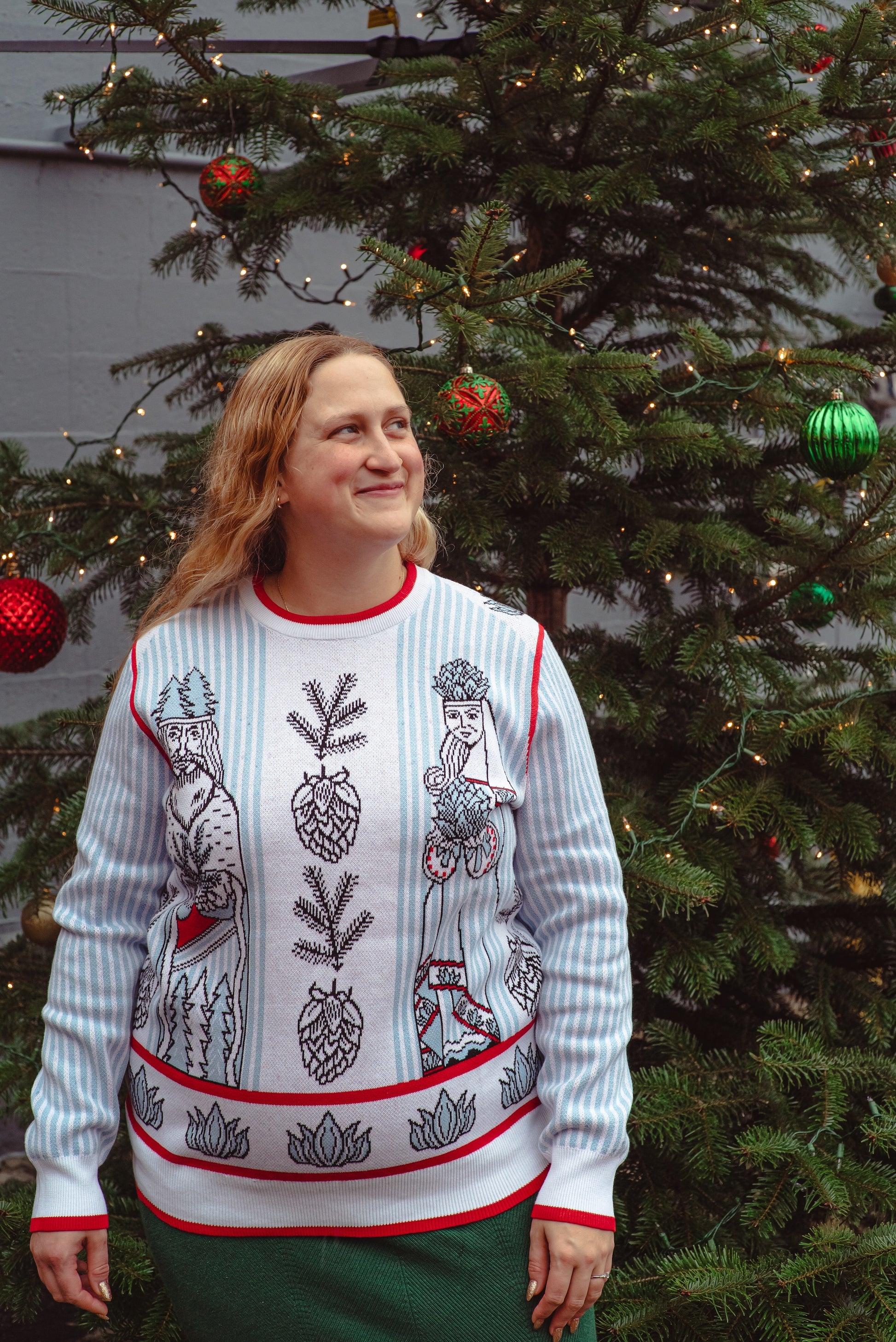 100% Cotton. The sweaters run small, we recommend sizing up.